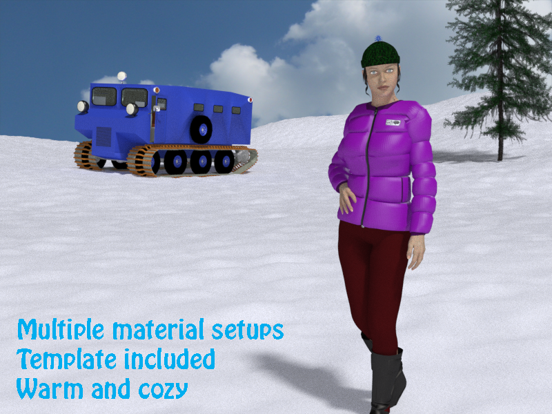 It's a conforming puffy jacket for Vicky 4, ready for ski season or cold weather or just looking snazzy. I‘ve included a bunch of material setups including some with a brand label; feel free to make more materials of your own (I‘d love to see them!) but remember-