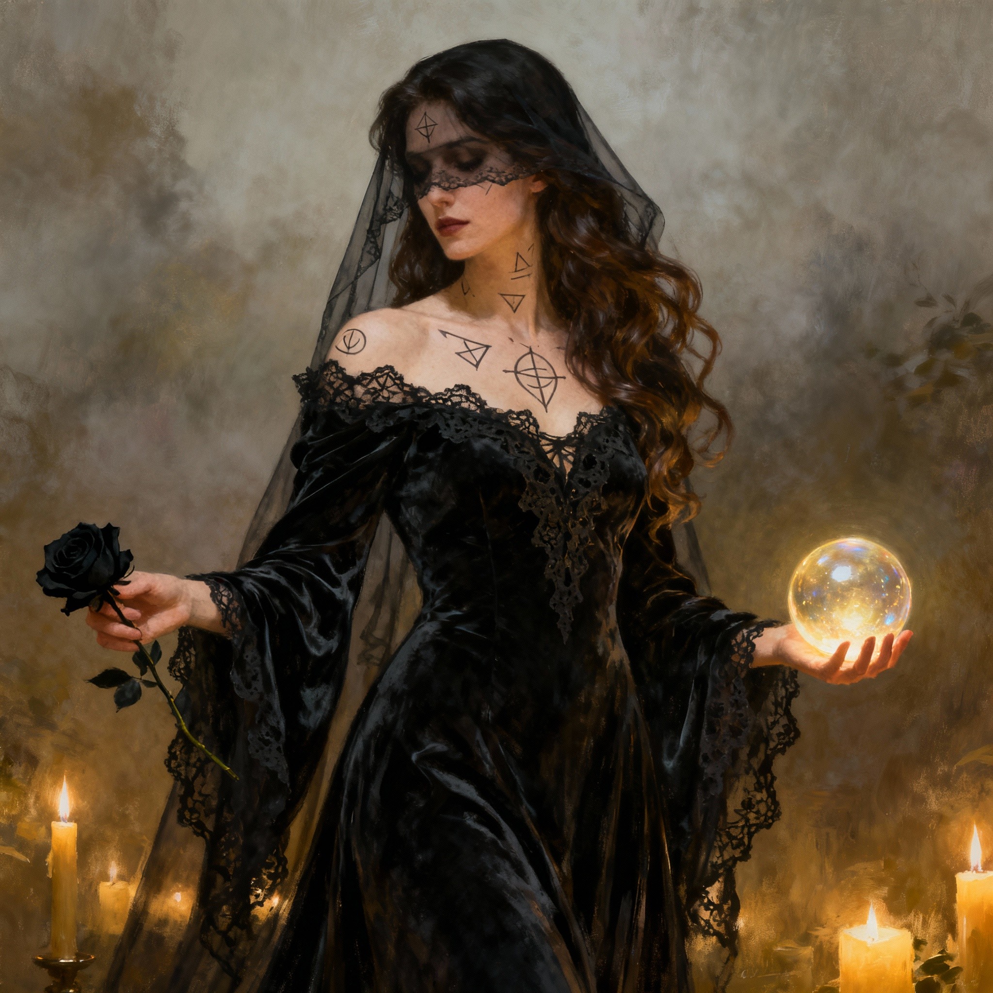 Very nice! Like her pose and the lighting. She has a black rose. Fitting. But...yuck! My neighbor 2 houses down planted black flowers. Yuck!
