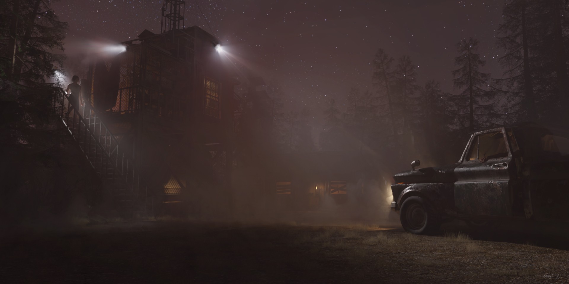 Spot lights are Epic God rays using Dispersive, no dust, no fx. post denoiser on. I adjusted the opacity on the individual ray plans, played with the atmosphere cube and fx and bloomed in the render settings to get what you see.....I did post work out a couple of sharp light edges near the pickup but rest of the lighting turned out as intended. Just a matter of playing with opacity, atmos cube and fx plans to get the light to fill in and definitely the post noise filter when rendering in Daz at least or it looks way different and nowhere near cool.